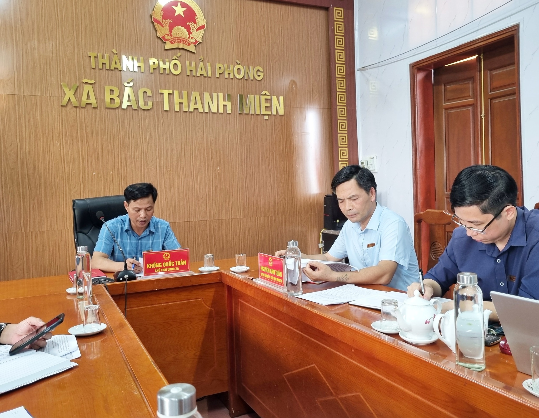 Đồng chí Khổng Quốc Toản, Phó BT Đảng ủy - Chủ tịch UBND xã - Trưởng tiểu ban chủ trì cuộc họp