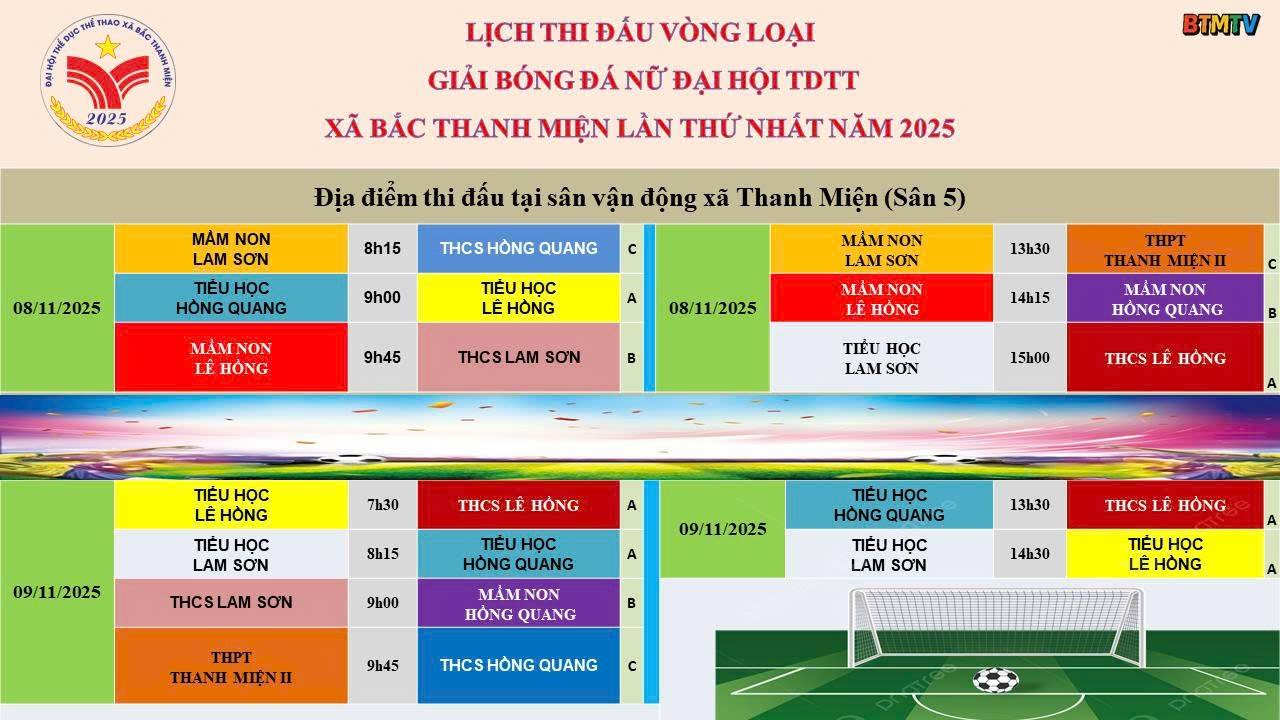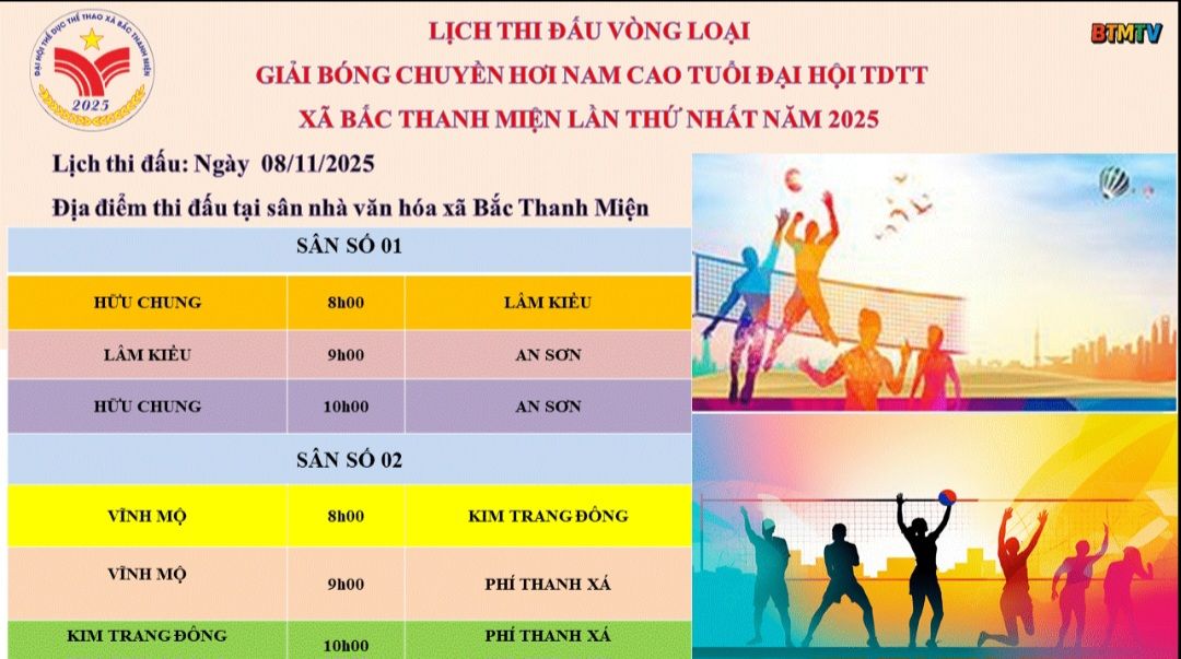 LỊCH THI ĐẤU VÒNG LOẠI MÔN BÓNG CHUYỀN HƠI CAO TUỔI VÀ BÓNG ĐÁ NỮ TRONG CHƯƠNG TRÌNH THI ĐẤU ĐẠI HỘI THỂ DỤC THỂ THAO XÃ BẮC THANH MIỆN LẦN THỨ I, NĂM 2025.