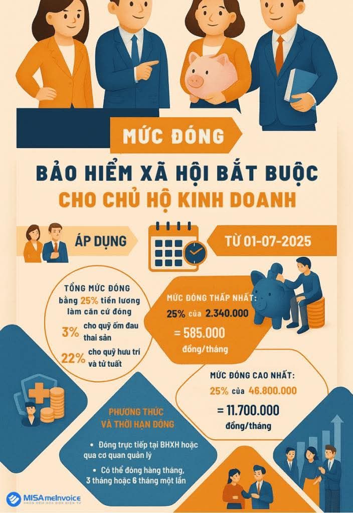 Cụ thể, mức đóng bảo hiểm xã hội, bảo hiểm y tế hằng tháng của chủ hộ kinh doanh bằng 29,5% tiền lương làm căn cứ đóng, trong đó, 3% vào quỹ ốm đau, thai sản; 22% vào quỹ hưu trí, tử tuất và 4,5% vào quỹ bảo hiểm y tế.