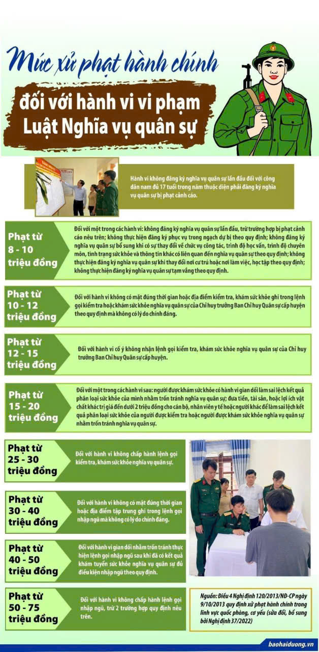 Phạt 50–75 triệu đồng: Không chấp hành quyết định gọi kiểm tra, khám sức khỏe nghĩa vụ quân sự hoặc nghĩa vụ tham gia CAND.